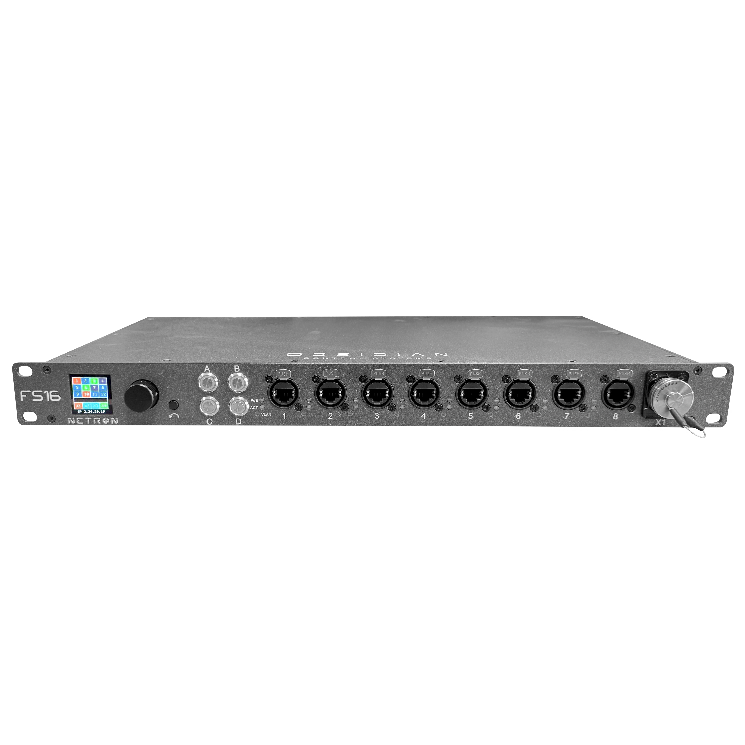 The FS16 incorporates four dedicated preset buttons on the front, which are ideally positioned to work as a Network Selector switch. Instant recall of signal routing allows main and backup consoles or various front-of-house setups to be activated at a moment’s notice and without delay. Instant network selections are also possible using an external remote control over a simple RJ45 cable, or the remote web interface.