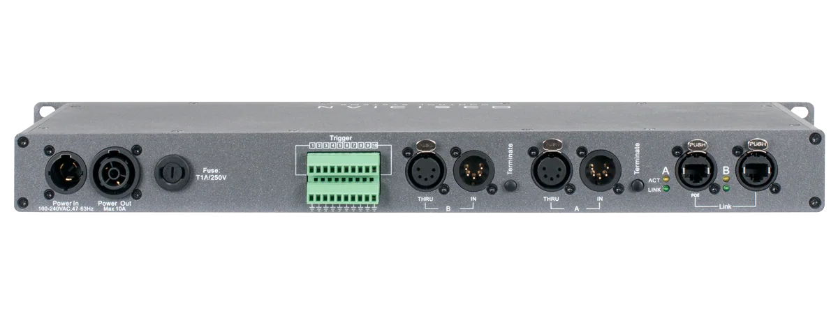The NETRON RDM 10 is a first of its kind hybrid splitter. Dual DMX input, 10 port RDM Splitter, Merger and EtherDMX Gateway are unified into the RDM10, with an advanced feature set to cover a wide variety of applications. 99 internal cues, factory and user presets plus external contact closures provide a unique combination of multiple devices to solve many required tasks in one powerful unit.